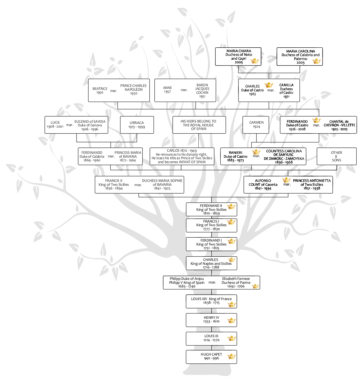 The reign of Francis II began amidst a dangerous international crisis, after the Second Italian War of Independence. The end of Austrian influence on the Italian peninsula, the rise of Cavour's Piedmont, and British hostility led to the "Expedition of the Thousand" in 1860, finally supported by an invasion by the House of Savoy army from the north. Faced with such a blatant violation of his neutral kingdom, Francis II appealed to international law at a time when the subject had long been recognized, but not yet well defined, as it would be after the World Wars. The king withdrew to the fortress of Gaeta with his young queen Marie Sophie, defending his right to govern with honor, but in vain. Francis died in 1894, exiled in Austrian Trentino, without any direct descendants and transferring his rights to his brother Alphonse, Count of Caserta (1841-1934). After the Act of Cannes in 1900, the rights of succession passed to Alphonse's son, Rainier, Duke of Castro (1883-1973), and then to the Duke's descendants: his son Ferdinand (1926-2008) and grandson Charles (1963), who is currently committed to continuing the history and legacy of a kingdom and a dynasty, combining tradition and innovation within a modern European monarchy. In this context fits Prince Charles's historic decision in 2016 to disregard Salic law and refer to European law prohibiting discrimination between men and women, by naming his eldest daughter, Princess Maria Carolina, Duchess of Calabria, as his legitimate heir.